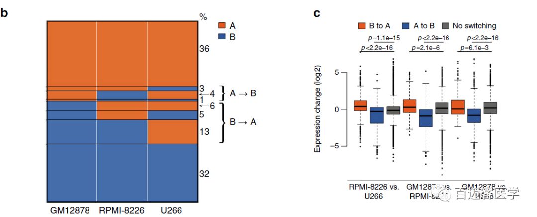 結(jié)合Hi-C、RNA-seq數(shù)據(jù),作者對(duì)MM細(xì)胞與淋巴母細(xì)胞樣B細(xì)胞系(GM12878)進(jìn)行了比較,發(fā)現(xiàn)與正常B細(xì)胞相比,大多數(shù)基因組區(qū)域在MM細(xì)胞中保持相同的compartments。共有8%的基因組區(qū)域從正常B細(xì)胞的compartment?A在MM細(xì)胞中轉(zhuǎn)換為compartment?B,并與下調(diào)基因表達(dá)相關(guān)。24%的基因組區(qū)域從compartment?A轉(zhuǎn)換為compartment?B,并與上調(diào)基因表達(dá)相關(guān)。