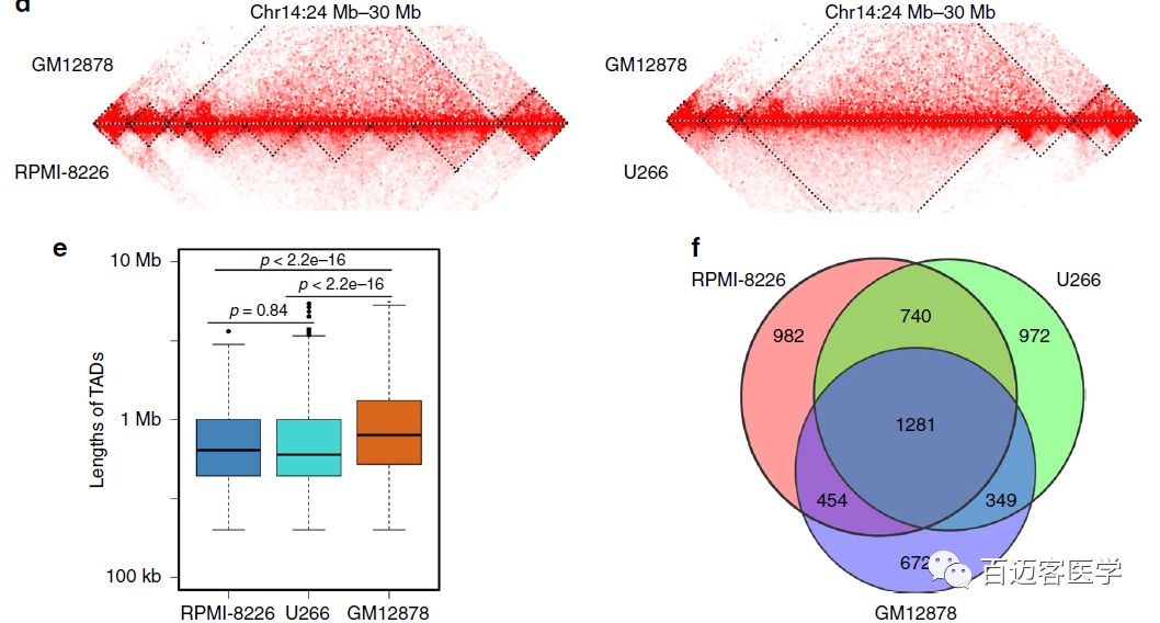 此外,GM12878、RPMI-8226和U266細(xì)胞中分別識(shí)別出了2756、3457和3342個(gè)TAD,TAD大小中值分別為800?kb、600?kb和640 kb。兩種MM細(xì)胞TAD數(shù)量較B細(xì)胞均增加1.2倍,且MM細(xì)胞TAD長度較小。作者在3個(gè)樣本中鑒定出1281個(gè)保守TAD(TAD重疊超過70%),而僅在2個(gè)MM細(xì)胞存在的保守TAD有740個(gè)。