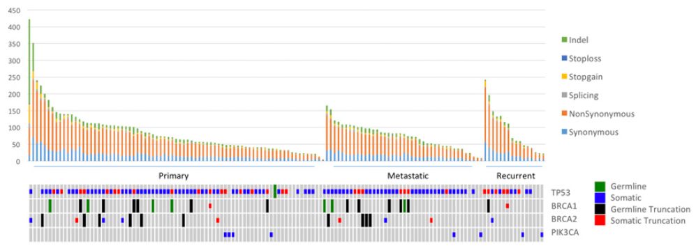 1、研究者通過(guò)全外顯子組測(cè)序(WES)分析了來(lái)自77名單側(cè)卵巢癌患者的122例新鮮凍存腫瘤組織(64個(gè)原發(fā)灶,41個(gè)轉(zhuǎn)移灶和17個(gè)復(fù)發(fā)灶,其中原發(fā)灶中含有分別與轉(zhuǎn)移灶和復(fù)發(fā)灶相匹配的樣本)以及匹配的正常DNA(來(lái)自靜脈血等)的突變情況。