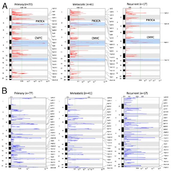 成對(duì)外顯子測(cè)序數(shù)據(jù)SCNA分析表明,在原發(fā)灶與復(fù)發(fā)灶匹配的17名患者中,4名患者獲得了PIK3CA擴(kuò)增(3q26),2名患者在復(fù)發(fā)腫瘤中獲得了c-MYC擴(kuò)增(8q23-24)。GISTIC分析表明,PIK3CA和c-MYC擴(kuò)增在樣本間具有顯著重現(xiàn)性,其頻率在復(fù)發(fā)灶、轉(zhuǎn)移灶和原發(fā)灶依次降低。