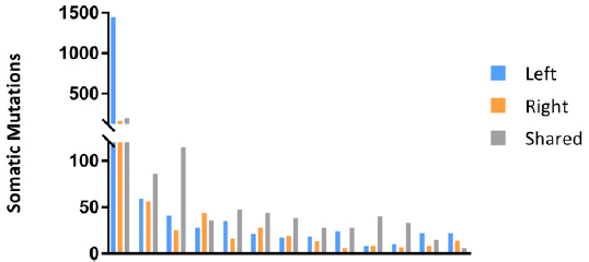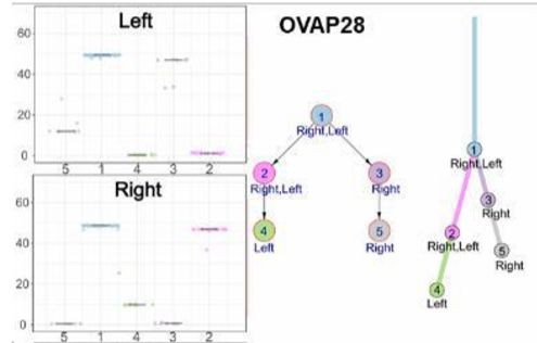 2、研究者也對(duì)13對(duì)雙側(cè)卵巢癌(synchronous bilateral ovarian cancer,SBOC)進(jìn)行了測(cè)序,評(píng)估腫瘤克隆進(jìn)化,以確定左右兩側(cè)腫瘤是否獨(dú)立地作為2個(gè)不同的腫瘤,還是分別代表原發(fā)性和轉(zhuǎn)移性腫瘤。分析表明,體細(xì)胞突變?cè)?側(cè)腫瘤廣泛共享,所有病例中均顯示2側(cè)腫瘤起源于共同的祖先。