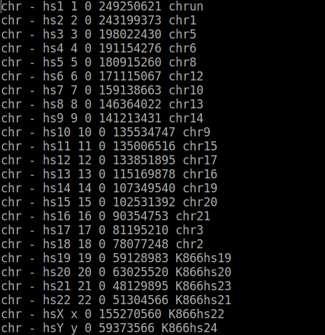 Circos圖可以展示數(shù)據(jù)在染色體上的分布情況,首先我們需要一個染色體的信息文件,畫出染色體的圈,該信息由circos.conf的karyotype參數(shù)進行設(shè)置,如下圖: