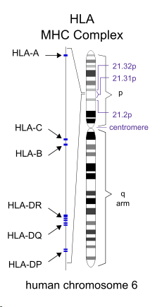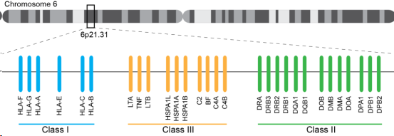 HLA全長(zhǎng)約3.6M,含有220多種功能不同的基因,是目前已知的人類(lèi)染色體中基因密度最高、多態(tài)性最為豐富的區(qū)域,位置示意圖如下: