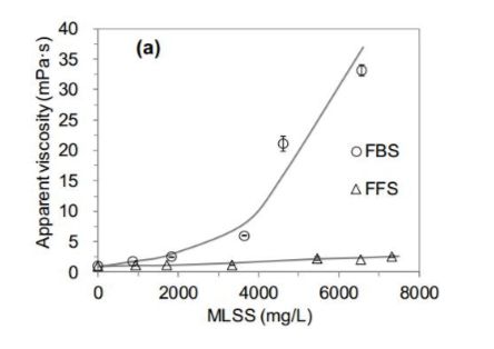 圖4. FBS和FFS的表觀粘度與(a)MLSS、(b)KLa(20)和(c)α-因子的相關(guān)性。