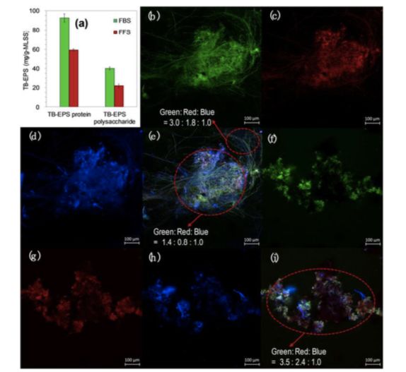 圖5.?(a)?FBS和FFS的胞外聚合物(EPS)濃度比較;共聚焦激光掃描顯微鏡(CLSM)拍攝的FBS(b)蛋白,(c)α-多糖,(d)β-多糖,(e)所有EPS;CLSM拍攝的FFS(f)蛋白,(g)α-多糖,(h)β-多糖,(i)所有EPS