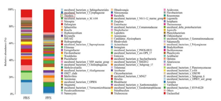 FBS和FFS的菌群結(jié)構(gòu)如圖7所示。FBS和FFS含有大量的共有菌,其中絲硫菌屬(thiothrix)、球衣菌屬(Sphaerotilus)、古字狀菌屬(Runella)、meganema(甲基桿菌科分類下的屬)、纖毛菌屬(Leptothrix)、金黃桿菌屬(chryseobacterium)、毛球菌屬(Trichococcus)、黃桿菌屬(Trichococcus)、isosphaera(浮霉菌科分類下的屬)和浮霉菌科(planctomycetaceae)是FBS和FFS豐度排名前十的菌;?FBS和FFS的優(yōu)勢(shì)菌存在差異,未分離培養(yǎng)(uncultured)的噬纖維菌(cytophagaceae)和鞘脂桿菌(sphingobacteriales)分別在FBS和FFS中豐度最高;FFS和FBS的所有菌在各自反應(yīng)器的排出水中均被檢測(cè)到。從圖8來(lái)看,絲硫菌屬(thiothrix)在FFB中的相對(duì)豐度超過(guò)8.5%,而在FFS中數(shù)量極少,絲硫菌屬(thiothrix)的長(zhǎng)菌絲(0.5-1.5 μm)會(huì)連接污泥絮狀物,導(dǎo)致污泥降解能力降低,污水的表面粘度增加;盡管球衣菌屬(Sphaerotilus)和古字狀菌屬(Runella)在FFS和FBS中的豐度均較高,但它們的菌絲較短,對(duì)污泥沉降、表觀粘度和氧轉(zhuǎn)運(yùn)的負(fù)面影響較??;其他絲狀細(xì)菌的豐度較低,影響程度較小。因此推測(cè),絲硫菌屬(thiothrix)就是影響FBS氧轉(zhuǎn)運(yùn)的最大“元兇”。從種水平來(lái)看,絲硫菌屬(thiothrix)分類下的eikelboomii是FBS的優(yōu)勢(shì)菌,至此,“真兇”也基本確定。