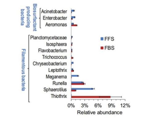 目前,已經(jīng)報(bào)道有超過(guò)30種微生物能夠合成生物表面活性劑,其中3種出現(xiàn)在本研究的FBS和FFS樣品中,它們分別是氣單胞菌屬(aeromonas)、腸桿菌屬(enterobacter)和不動(dòng)桿菌屬(enterobacter)(圖8)。然而,F(xiàn)BS中的腸桿菌屬(enterobacter)和不動(dòng)桿菌屬(acinetobacter)相對(duì)豐度(0.24%和0.08%)明顯低于FFS(0.81%和0.63%),表明FBS中細(xì)菌合成的生物表面活性劑不是降低氧轉(zhuǎn)運(yùn)的“主謀”。