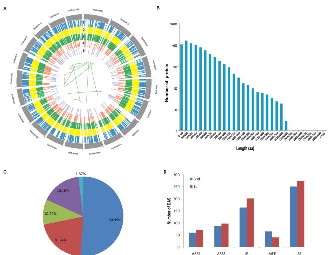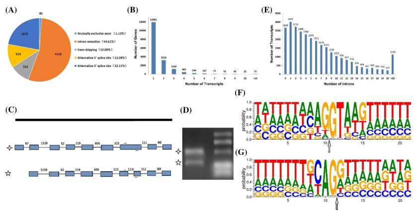紫花苜蓿(Medicago sativa L.)原產于亞洲西南部,是世界上最重要的豆科牧草植物,具有生態(tài)適應性廣、抗逆性強、營養(yǎng)價值高、產量高、適口性好、生物固氮能力強等優(yōu)點。由于苜?;蚪M的復雜性和基因組組裝尚未完成,其mRNA轉錄本的序列和完整結構尚不清楚。本文通過三代全長轉錄組測序,在紫花苜蓿的幼葉、成熟葉片和衰老葉片中共計獲得113,321個轉錄本,72,606 個ORFs,其中46,616為全長ORFs,以及來自54個轉錄因子家族的1,670個轉錄因子和44,040個SSRs. 通過功能注釋分析可得,有115個基因參與黃酮類代謝通路,32個基因參與玉米素的生物合成,213個轉錄本參與苜蓿衰老生物過程。通過與苜?;蚪MCADL_HM342.v0.95P比較,共鑒定到個7,568個可變剪接事件,其中4,133個為內含子保留,1,673為3’端可變剪接,914個5’端可變剪接,763個外顯子跳躍和85個可變多外顯子。其中內含子保留為主要的可變剪接形式。本研究新發(fā)現(xiàn)為改進紫花苜?;蚪M注釋和充分鑒定轉錄組提供了重要信息。