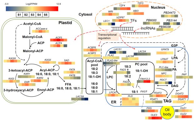 蓖麻油酸是一種高價值的羥基脂肪酸,具有十分廣泛的工業(yè)應用前景。風箏果種子中含有約80%的蓖麻油酸,是該不飽和脂肪酸的新來源。為了探究蓖麻油酸在體內合成和調控的分子機制,本研究收取不同發(fā)育階段的風箏果種子進行脂肪含量分析并發(fā)現(xiàn),在種子發(fā)育的前中期(授粉后的16-22天),蓖麻油酸迅速富集。結合二代和三代全長轉錄組測序,共鑒定到12,555個差異轉錄本,其中GO注釋富集到與脂質代謝相關的96條term共1,049個DEGs;454個DEGs 富集到16條脂質代謝相關的KEGG通路中。綜合分析,共鑒定到包括參與脂質代謝的71種酶,246個潛在的轉錄因子及124個長鏈非編碼RNA(lncRNAs);其中有12個基因參與多種脂質代謝通絡,如脂肪酸的生物合成和修飾(羥基化)、脂質轉運、三酰甘油合成、?;庉嫼椭涡纬傻?,且在種子發(fā)育過程中,呈現(xiàn)高表達水平,并與蓖麻油酸的累積模式一致。通過共表達網(wǎng)絡分析,還鑒定到57個轉錄因子和35個lncRNA與蓖麻油酸的合成有關。本研究結果為在轉錄水平上開發(fā)一種新的蓖麻油酸原料奠定了基礎,為其他植物中蓖麻油酸的生產提供了有價值的候選基因。