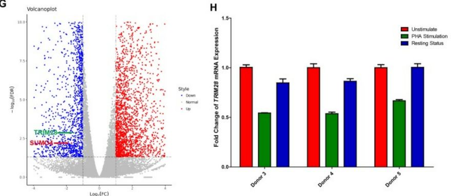 通過實(shí)驗(yàn)發(fā)現(xiàn)si-TRIM28過表達(dá)抑制了HIV-1啟動(dòng)子活性的基礎(chǔ)水平,并以劑量依賴的方式挽救了HIV-1抑制;當(dāng)與HIV-1 Tat和TNFα組合過表達(dá)時(shí),上調(diào)更顯著;TRIM28在多種細(xì)胞系和原代細(xì)胞中普遍表達(dá)。為搜索HIV-1潛伏相關(guān)基因,作者利用RNA-Seq比較未刺激和PHA刺激的原代CD4+?T細(xì)胞中的基因表達(dá)作為補(bǔ)充實(shí)驗(yàn),TRIM28在未刺激的原代CD4+?T細(xì)胞中高表達(dá),并在PHA激活后下調(diào)。當(dāng)活化的CD4+?T細(xì)胞恢復(fù)到靜止?fàn)顟B(tài)時(shí),TRIM28的表達(dá)再次上調(diào)。為了測(cè)試TRIM28是否有助于HIV-1潛伏,在HIV-1潛伏細(xì)胞系J-Lat 10.6以及其他HIV潛伏細(xì)胞系模型(J-Lat 6.3/8.4/9.2和15.4)中敲低了TRIM28,發(fā)現(xiàn)TRIM28的缺失上調(diào)了HIV-1的表達(dá)。此外,當(dāng)補(bǔ)充廣泛定義的LRA:組蛋白去乙?;福℉DAC)抑制劑SAHA或BET結(jié)構(gòu)域抑制劑JQ-1時(shí),HIV-1重新激活增強(qiáng)得更高。