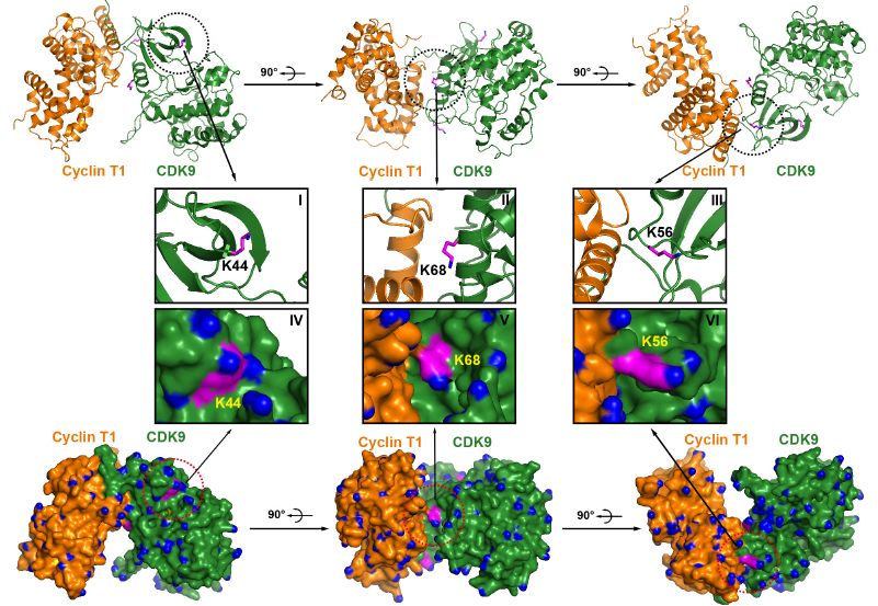 為了進(jìn)一步確定哪些位點(diǎn)確實(shí)僅被TRIM28 SUMO化,作者敲除了內(nèi)源性TRIM28并測(cè)試了上述鑒定候選位點(diǎn)的SUMO化潛力,發(fā)現(xiàn)Lys44、Lys56和Lys68的SUMO 化信號(hào)在缺乏內(nèi)源性TRIM28時(shí)完全消失,進(jìn)一步支持這些位點(diǎn)被TRIM28特異性SUMO化。直接分析富集的SUMO-CDK9的靶特異性SUMO-MS也證實(shí)了該結(jié)果。Lys44的乙?;瞧浼っ富钚运匦璧?,其他2個(gè)SUMO化位點(diǎn)Lys56和Lys68在CDK9和細(xì)胞周期蛋白T1的相互作用區(qū)域內(nèi)。SUMO蛋白是多肽大分子,它的存在可以形成空間位阻,從而阻止P-TEFb復(fù)合物的形成。