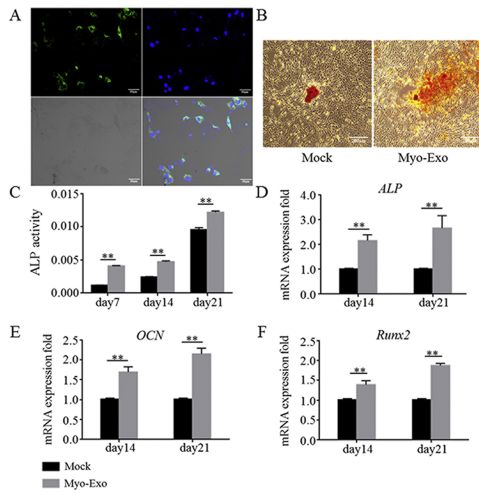 1、C2C12成肌細(xì)胞分泌的外泌體可以進(jìn)入前成骨細(xì)胞MC3T3-E1,促進(jìn)其成骨分化。