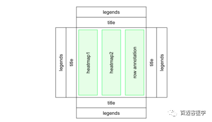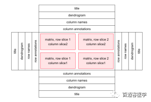 單個(gè)熱圖由熱圖主體和熱圖組件組成。 熱圖主體可以按行和列分割。 熱圖組件是標(biāo)題,樹(shù)形圖,矩陣名稱和熱圖注釋,它們放在heamap體的四個(gè)側(cè)面上。
