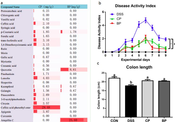 本文旨在研究不同多酚組成的中國蜂膠(CP)和巴西蜂膠(BP)對右旋糖酐硫酸鈉(DSS)誘導(dǎo)的大鼠結(jié)腸炎是否起到保護作用。