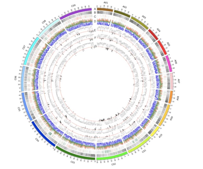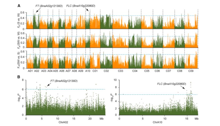 該研究對991份油菜天然種質(zhì)資源進行了遺傳多樣性的測序和鑒定。通過對兩個不同的參考基因組,即“Darmor-bzh”和“Tapidor”基因組的定位讀數(shù)產(chǎn)生的兩組SNPs的群體遺傳學(xué)分析,得出了一致的結(jié)論。遺傳多樣性和連鎖不平衡參數(shù)表明甘藍型油菜兩個亞基因組的進化是不對稱的。選擇性掃描分析揭示了與調(diào)控植物發(fā)育和應(yīng)激反應(yīng)的各個方面相關(guān)的基因的遺傳變化。并對影響開花時間的SNPs進行了探索。