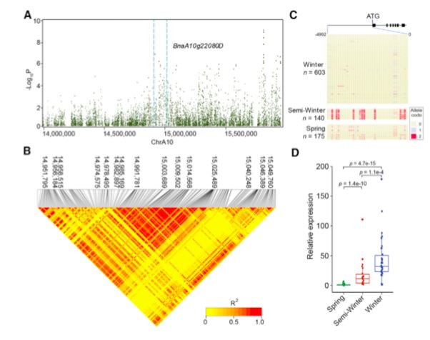 BnaA10g22080D是擬南芥FLC的一個假定的同源基因,在Chr.A10的14.99-15.01 Mb之間的區(qū)域內(nèi)被鑒定(圖3B)。GWAS和LD分析表明,BnaA10g22080D的5’調(diào)控區(qū)的SNPs與品種間開花時間的變化顯著相關(guān)(圖6A和6B)。