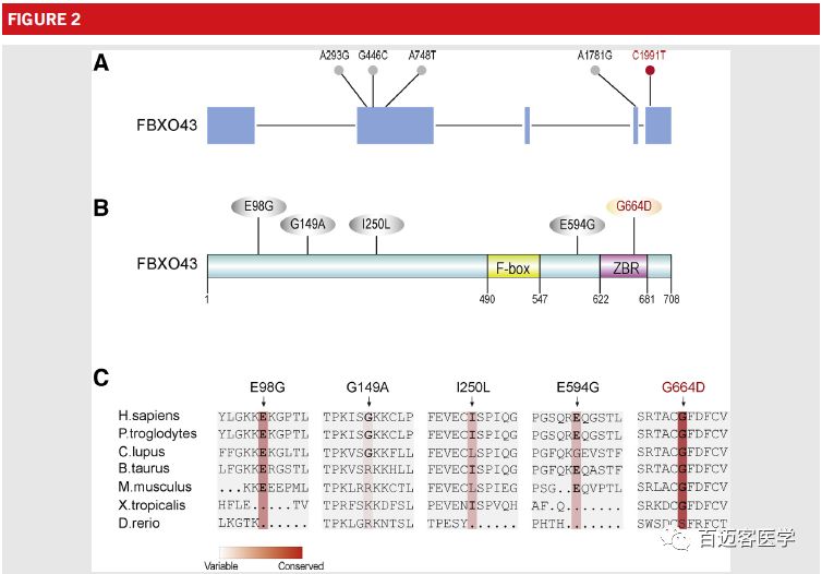 (注:該圖中除C1991T(G664D)外,其他突變?yōu)樵谏l(fā)樣本中發(fā)現(xiàn)的FBXO43基因突變)