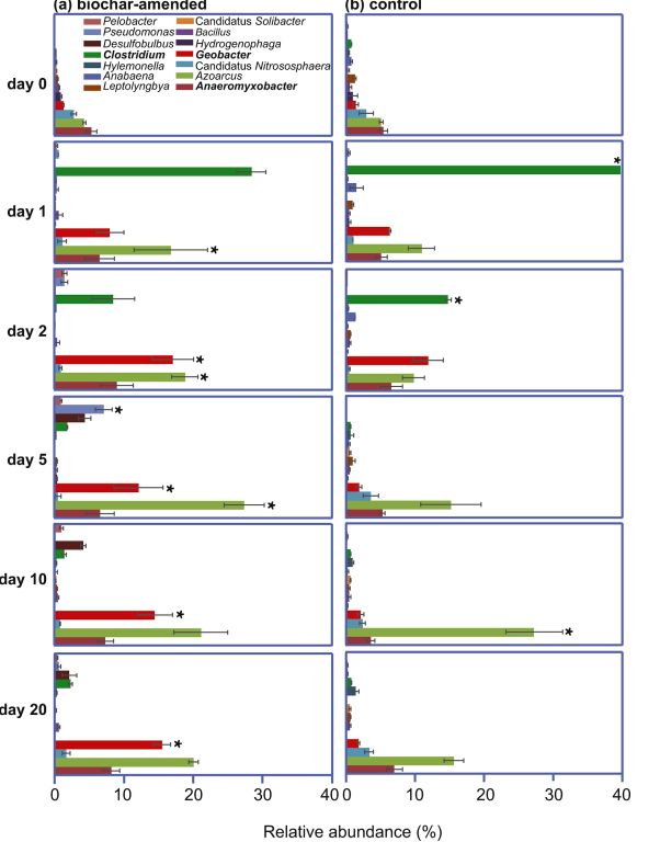圖4. 生物炭修正與無生物炭修正的水稻土壤的(a):地桿菌(geobacter);(b)梭菌(clostridium);(c)厭氧粘細(xì)菌(Anaeromyxobacter)和(d)希瓦氏菌(Shewanella)的相對(duì)轉(zhuǎn)錄豐度。