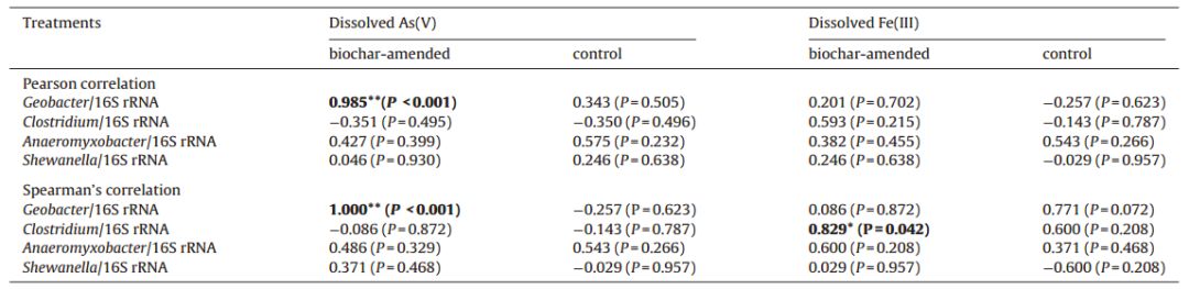 表1. 地桿菌(Geobacter)、?梭菌(Clostridium)、厭氧粘細(xì)菌(Anaeromyxobacter)和希瓦氏菌(Shewanella)的相對(duì)轉(zhuǎn)錄水平與釋放砷As(V)和鐵Fe(III)的Pearson和Speraman相關(guān)性檢驗(yàn).