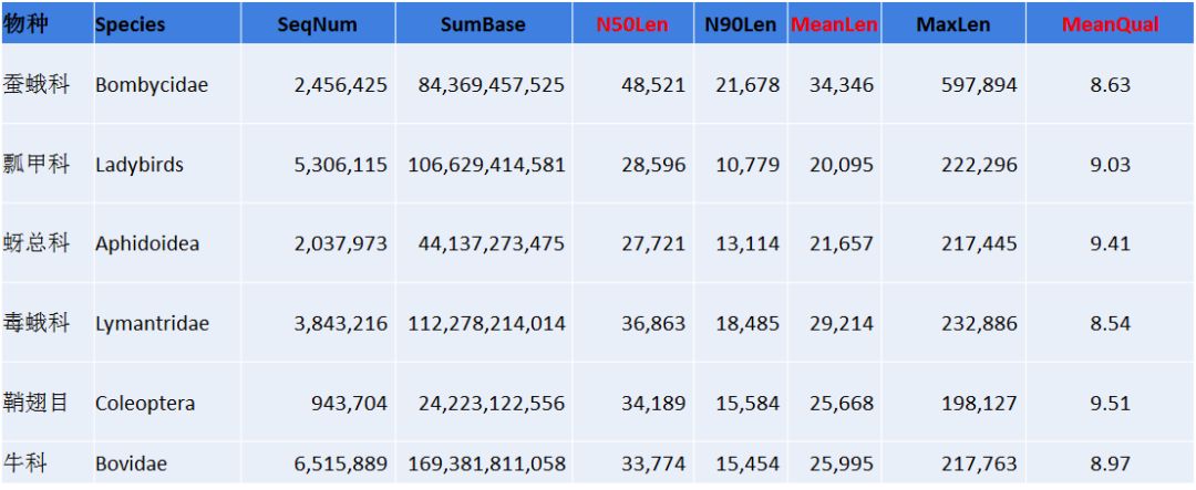 注:Species:分析的物種信息;SeqNum:各個長度范圍內(nèi)序列的數(shù)目;SumBase:指各個長度范圍內(nèi)序列的總長度;N50Len:reads N50長度;N90Len:readsN90長度;MeanLen:平均reads長度;MaxLen:最長reads長度;MeanQual:質(zhì)量值。