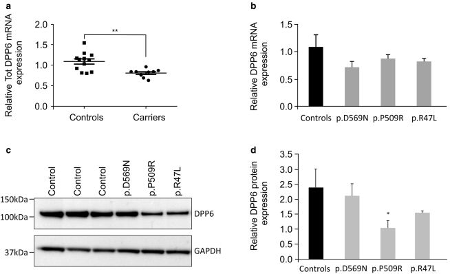 只有3個(gè)攜帶DPP6無義突變的患者的解剖大腦被凍存。這三個(gè)患者的神經(jīng)病理學(xué)診斷分別是阿爾茲海默癥AD,F(xiàn)TLD-TDP typeD(FTD行為變異和佩吉特氏骨病),F(xiàn)TLD-ALS type B(FTD行為變異及球類型)。結(jié)果發(fā)現(xiàn)三個(gè)DPP6變異(p.P509R, p.R47L, and p.D596N)?的mRNA表達(dá)水平顯著下調(diào),并且發(fā)現(xiàn)p.P509R和p.R47L 攜帶者的DPP6蛋白表達(dá)水平也顯著下降。