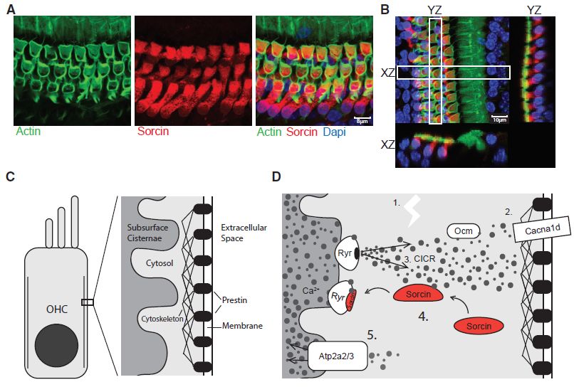 免疫熒光僅將sorcin僅定位于OHC(圖3A,3B),假設(shè)類似的機(jī)制可以調(diào)節(jié)基于prestin的運(yùn)動(dòng)(圖3C和3D,動(dòng)力蛋白?Prestin是一種高度專業(yè)化的蛋白質(zhì),可以起到驅(qū)動(dòng)耳蝸中外部毛細(xì)胞的作用,使耳蝸可以讓人們和動(dòng)物聽到聲音)。與此可能性一致,作者確定了在OHCs中表達(dá)sorcin介導(dǎo)的興奮-收縮途徑的基本組分,包括(1)電壓門控鈣釋放通道,(2)促進(jìn)CICR的通道,(3)終止CICR的機(jī)制(sorcin),和(4)鈣泵使釋放的Ca2+返回Ca2+儲(chǔ)庫(kù)(圖3E)。本數(shù)據(jù)集和他人數(shù)據(jù)集中檢測(cè)到的第一個(gè)組分是耳聾基因Cacna1d,一種在OHCs中高表達(dá)的電壓門控鈣釋放通道,參與心動(dòng)過(guò)緩有關(guān)的綜合征性耳聾;第二個(gè)組分,即促進(jìn)CICR的通道,包括Ryr1、Ryr2和Ryr3。在通過(guò)Ryr通道誘導(dǎo)CICR后,sorcin的作用可能是通過(guò)在Ca2+存在下阻斷Ryr受體來(lái)快速終止CICR,這是先前在心肌細(xì)胞中報(bào)道的途徑。已知定位于OHC表面下池的Ca2+?ATP酶泵可從細(xì)胞溶質(zhì)中除去Ca2+。附著蛋白質(zhì)(Ocm)等結(jié)合并緩沖Ca2?+的輔助蛋白質(zhì)可能有助于這一過(guò)程。