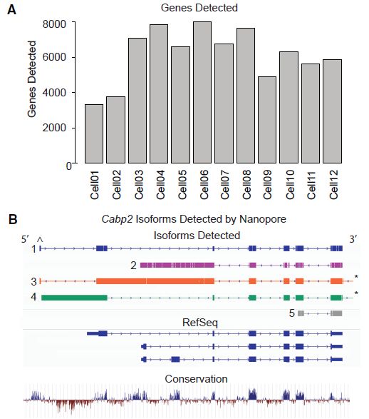 為了解決全長(zhǎng)isoform結(jié)構(gòu),進(jìn)行了ONT全長(zhǎng)轉(zhuǎn)錄組測(cè)序,并使用Illumina短reads序列數(shù)據(jù)作為確認(rèn)的scaffold,用于nonopore長(zhǎng)讀長(zhǎng)數(shù)據(jù)比對(duì)。與150-800bp片段大小的Illumina?reads不同,Nanopore測(cè)序不需要片段化文庫(kù),并且可以產(chǎn)生跨越mRNA轉(zhuǎn)錄本長(zhǎng)度的單一reads(圖6A和6B)。對(duì)p15時(shí)間點(diǎn)的12個(gè)OHC細(xì)胞加barcaod以在4個(gè)MinION?R9.4?flow?cell上測(cè)序所有樣品,同時(shí)保持單細(xì)胞分辨率(圖6A)。因?yàn)镺HCs是最多和最差異的Illumina數(shù)據(jù)集,這有助于跨平臺(tái)比較以驗(yàn)證長(zhǎng)reads和isoform定量。