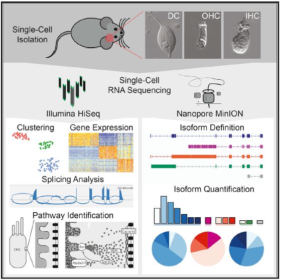 2、SmartSeq2單細(xì)胞擴(kuò)增,IHC?(n?=?42),?OHC?(n?=?127),?and?DC?(n?=?39)進(jìn)行二代Illumina平臺(tái)轉(zhuǎn)錄組測(cè)序;12個(gè)p15小鼠OHCs進(jìn)行ONT全長(zhǎng)轉(zhuǎn)錄組測(cè)序。