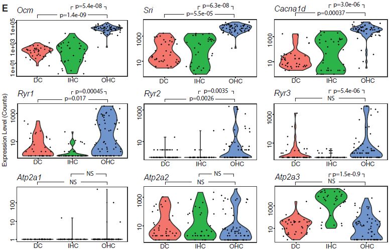 已知細(xì)胞類型marker基因高度差異表達(dá),例如prestin(Slc26a5),其在OHCs中穩(wěn)健且差異表達(dá)。與公布的OHC和IHC轉(zhuǎn)錄組數(shù)據(jù)進(jìn)行比較,搜索具有不一致排名的基因,假設(shè)通過(guò)AUC而不是表達(dá)水平對(duì)基因進(jìn)行排序?qū)⒃诟鼜V泛的表達(dá)水平上鑒定細(xì)胞類型定義基因。按AUC分類排名時(shí),兩個(gè)鈣相關(guān)基因Ocm和Sri在OHC定義基因列表中排名第一,甚至超過(guò)Slc26a5,排名第三(上圖2F)。先前已在OHC中報(bào)道了Ocm的表達(dá)。編碼蛋白質(zhì)oncomodulin(癌調(diào)蛋白)是鈣結(jié)合蛋白家族成員之一,它是耳蝸聽力擴(kuò)增所必需的。Sri編碼sorcin(可溶性耐藥相關(guān)鈣結(jié)合蛋白),一種在心肌細(xì)胞中表達(dá)的蛋白質(zhì),是鈣介導(dǎo)的興奮-收縮偶聯(lián)所必需的,通過(guò)抑制Ryr通道(Ca2+釋放通道/RyR受體)進(jìn)行鈣離子介導(dǎo)的鈣離子釋放?(CICR)。在肌細(xì)胞中,Ryr通道介導(dǎo)CICR,能夠從肌質(zhì)網(wǎng)中快速釋放Ca2+離子,從而產(chǎn)生對(duì)于肌肉收縮必不可少的時(shí)空限制性鈣火花。