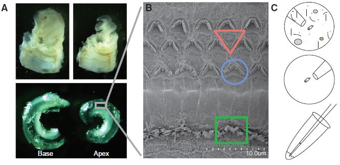 與哺乳動(dòng)物耳蝸中的各種支持細(xì)胞類型相比,聽覺HC的豐度較低。為了估計(jì)小鼠耳蝸膜迷路中可用于單細(xì)胞分離的HC數(shù)量,據(jù)報(bào)道在成熟的小鼠耳蝸中約765個(gè)IHCs,通過(guò)對(duì)小鼠顳骨中心切片,細(xì)胞核計(jì)數(shù),估計(jì)小鼠膜性迷路中的細(xì)胞數(shù)為415,395,其中IHC和OHC比例僅為0.19%和0.59%。