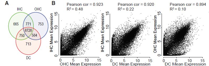 為了比較細(xì)胞類型之間表達(dá)譜,計(jì)算各cluster內(nèi)所有細(xì)胞中每個(gè)基因平均表達(dá)水平。通過(guò)維恩圖對(duì)平均表達(dá)譜比較,每種細(xì)胞類型約表達(dá)700個(gè)特異基因(OHC-753;?IHC-655;?DC-713;歸一化后counts>10)。且發(fā)現(xiàn)IHCs和DC具有高比例重疊(共享750個(gè)基因,與OHC和DC共享564個(gè)基因相比),但是IHC和OHC共享771個(gè)基因表達(dá)(圖2A)。為了更嚴(yán)格地測(cè)試每種細(xì)胞類型的轉(zhuǎn)錄相似性,使用所有基因進(jìn)行Pearson相關(guān)和R2回歸分析。回歸分析,所有3組間比較中發(fā)現(xiàn)了強(qiáng)相關(guān)性,OHCs和IHC之間的相關(guān)性最高,OHCs和DC之間的相關(guān)性最低。OHC和DC表達(dá)譜最不相似可能反映了OHC高水平特化(圖2B)。
