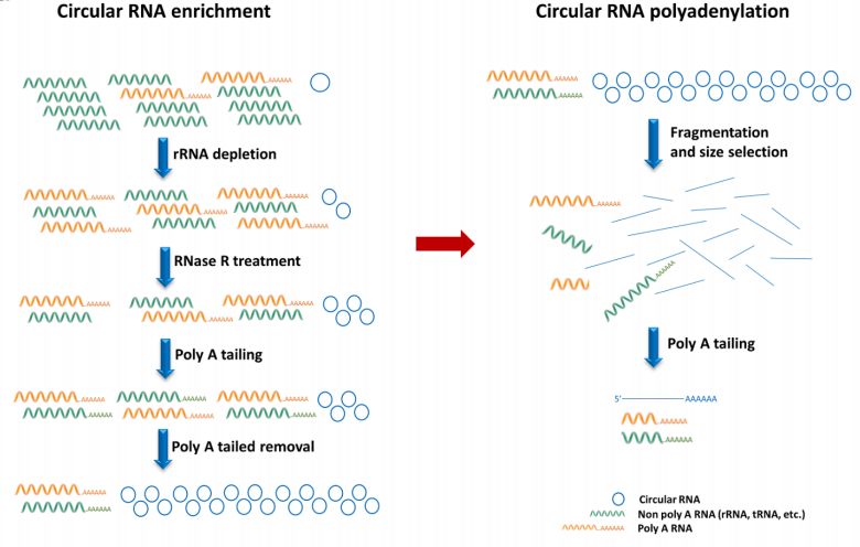 只有一小部分RNA是環(huán)狀的(例如,小鼠神經(jīng)系統(tǒng)中去rRNA的RNA庫中僅占約0.1%)。作者采用上述方法進行circRNA-ONT測序,由于有些線性RNA分子對RNase R具有抗性,故而此方法比普通的去線性circRNA建庫多了一步:將剩余的線性RNA多聚腺苷酸化(poly A tailing)并使用poly(A)純化磁珠去除帶polyA尾的RNA分子。結(jié)果表明,該步驟使circRNA強烈富集。