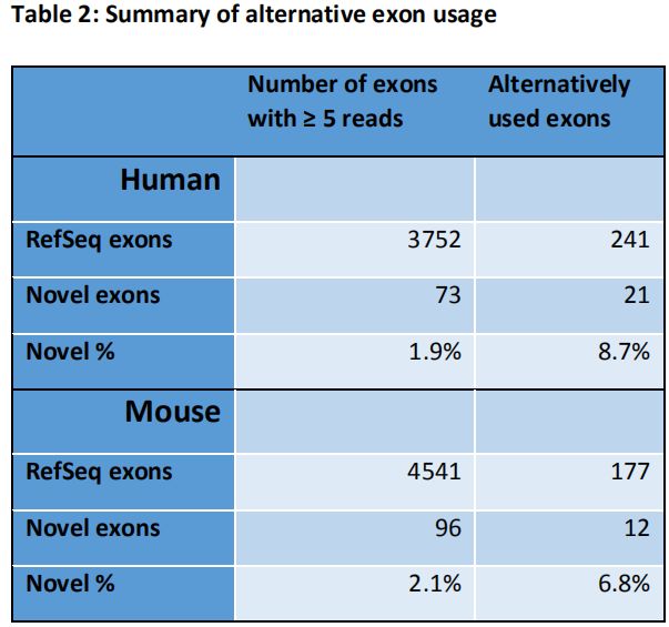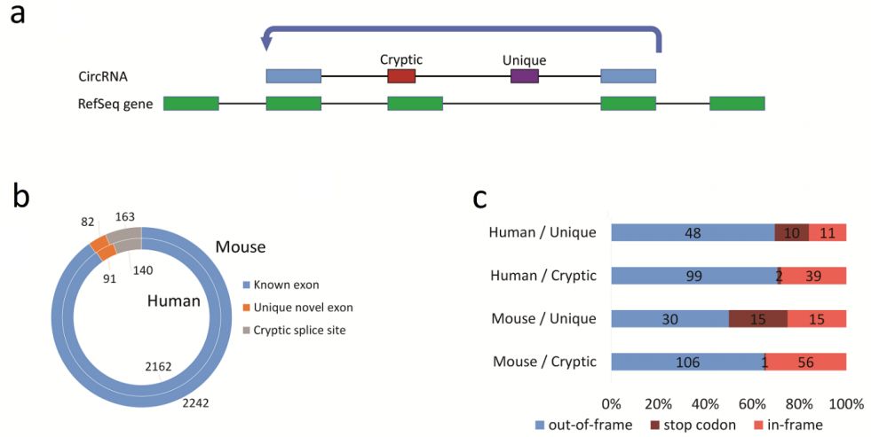 將circRNA根據(jù)新外顯子使用分類為“隱蔽的circRNA外顯子”(與注釋的外顯子共享5’或3’剪接位點)或“獨特的circRNA外顯子”(全新的外顯子)。人類2,393個外顯子中的91個和小鼠中2,487個外顯子中的82個是獨特的circRNA外顯子,140和163個分別是隱蔽的circRNA外顯子。(所有單外顯子circRNA都被排除在該分析之外,因為在單個read中需要完全覆蓋檢測到的外顯子,這對于單個外顯子circRNA而言在技術(shù)上是不可能的。)作者發(fā)現(xiàn)大多數(shù)獨特的circRNA外顯子在40-200bp范圍內(nèi),但也經(jīng)常觀察到3-6bp的非常短的外顯子(微外顯子)組。有趣的是,大多數(shù)circRNA特異性外顯子導(dǎo)致移碼突變或終止密碼子獲得,可能解釋了它們在線性mRNA翻譯中缺失,因此受到無義介導(dǎo)降解。