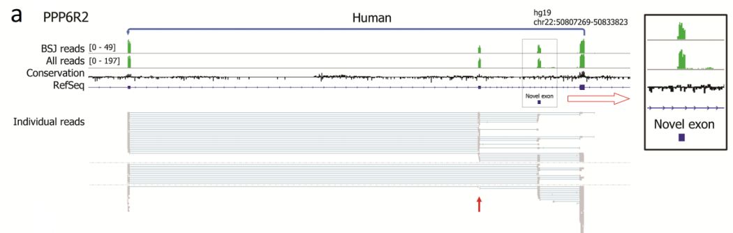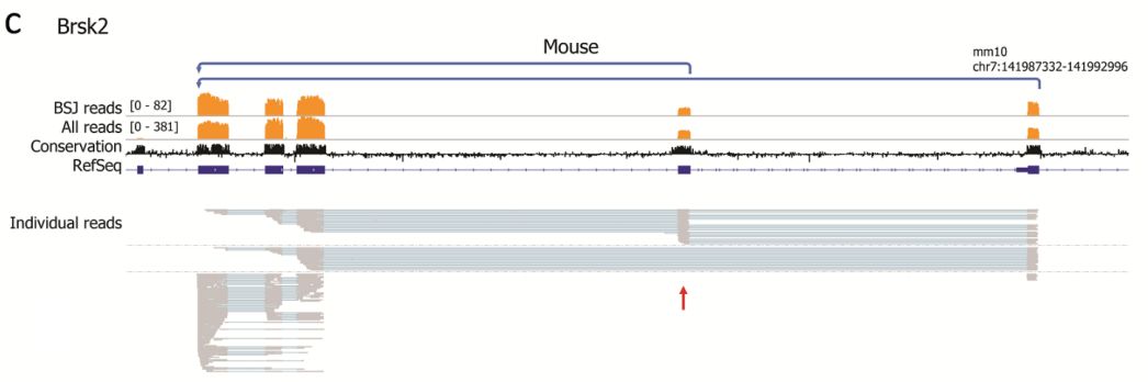 將所有小鼠和人跨越BSJ reads與各自的參考基因組比對,并定量比對到外顯子或內(nèi)含子區(qū)域的堿基對的數(shù)量。為了將分析集中于更豐富的circRNA中的內(nèi)含子保留和其他可變剪接事件,僅進一步研究了具有10個或更多BSJ reads并具有高于3%的平均內(nèi)含子百分比的circRNA。作者發(fā)現(xiàn)3個人和4個小鼠circRNA具有內(nèi)含子保留,而39和57個circRNA包含分別在人和小鼠的RefSeq中未注釋的外顯子序列。CAMSAP1 是circRNA內(nèi)含子保留實例,其僅發(fā)生在人RNA中;LPXN circRNA是僅在人中表達的circRNA。