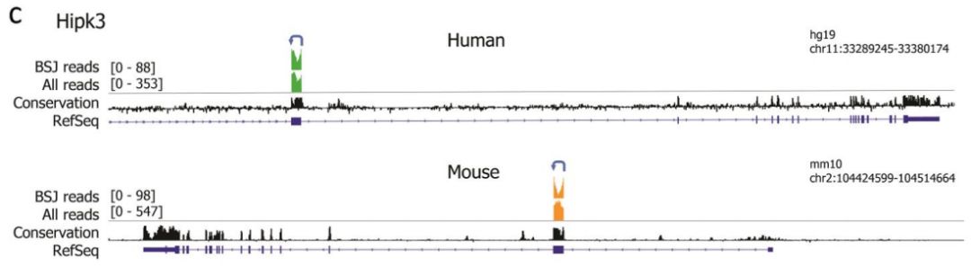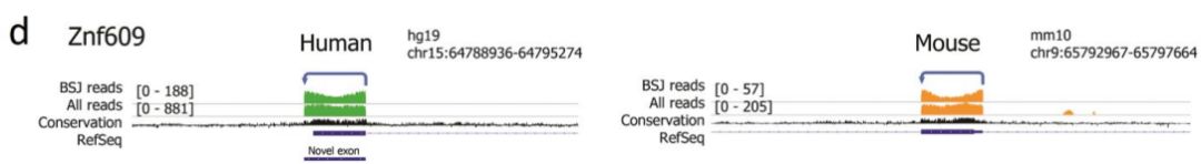 兩個高豐度circRNA:Hipk3和Zfp609(具有可變3’剪接位點的新型外顯子)的外顯子分布圖分別顯示在下圖: