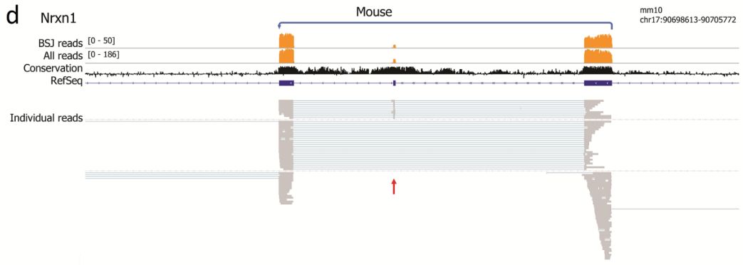 環(huán)狀RNA(circRNA)是一類知之甚少的非編碼RNA,其中一些已被證明對細胞增殖和發(fā)育具有功能重要。CircRNA主要來自編碼mRNA的反向剪接事件,使得難以區(qū)分circRNA與線性剪接的mRNA的內(nèi)部外顯子組成。為了檢查circRNA的全局外顯子組成,作者使用納米孔技術(shù)對人和小鼠腦源RNA進行了單分子長讀長測序。