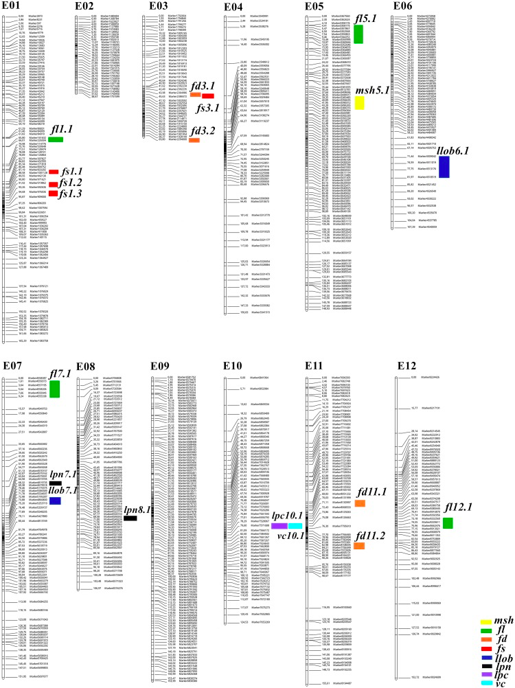 FL定位到4個(gè)QTL,即fl1.1, fl5.1, fl7.1, 與fl12.1,分別位于LG1,5,7,12上。最主效的QTL為fl12.1,可解釋24.05% 的表型變異,其次為fl1.1與fl5.1(PVE為12.00與13.06%),貢獻(xiàn)率最低的為fl7.1(PVE僅為4.08%),此外,在fl5.1中鑒定到11個(gè)SNPs。這4個(gè)QTLs中,除fl12.1的標(biāo)記Marker8964317遠(yuǎn)離其它兩個(gè)相鄰的標(biāo)記外,其它QTL標(biāo)記均處于合理的距離。
