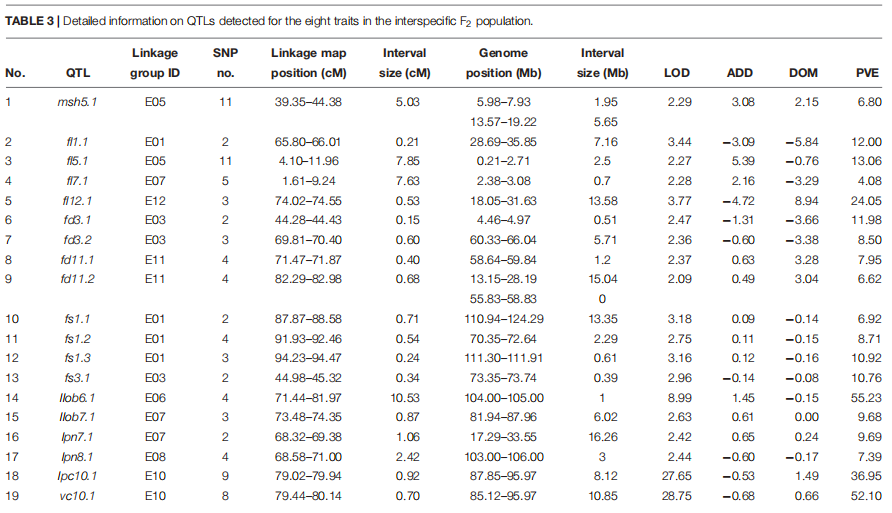 FD定位到4個(gè)QTL,分別位于LG3與11上,QTL貢獻(xiàn)率分別為fd3.1(11.98%)、fd3.2 (8.50%)、fd11.1 (7.95%)與fd11.2 (6.62%)。每個(gè)QTL的遺傳距離為0.15-0.68 cM.;fl12.1與fd3.2存在部分重疊,fd11.1與fd11.2分別跨越Chr11:71.47-71.87 cM and 82.29-82.98 cM。并且每個(gè)QTL包含的SNP數(shù)目為2-4個(gè)。
