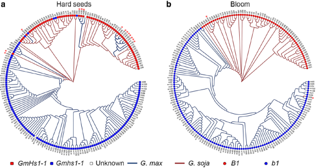 基因滲入被認(rèn)為是基因流的主要途徑,那么基因流如何在種群水平上影響馴化過(guò)程和大豆基因組的遺傳結(jié)構(gòu)?現(xiàn)有研究已分離出分別控制種子硬度和種皮開花的關(guān)鍵大豆馴化基因GmHs1-1和Bloom1(B1),圍繞GmHS1-1、Gmhs1-1和B1、b1基因座的兩個(gè)選擇性掃除區(qū)域中的SNP分析系統(tǒng)發(fā)育關(guān)系發(fā)現(xiàn)基因滲入現(xiàn)象在這兩個(gè)區(qū)域均有存在??紤]到野生大豆和栽培大豆亞種的系統(tǒng)發(fā)育差異,在研究種群中兩個(gè)馴化基因位點(diǎn)檢測(cè)到的選擇性掃描區(qū)域和單倍型的混合將被視為亞種群間基因流動(dòng)的進(jìn)一步證據(jù)。