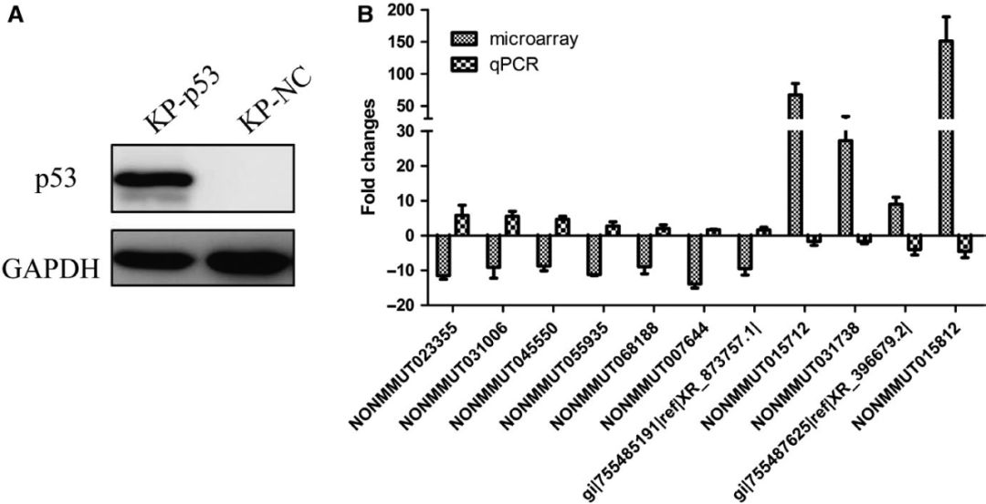 p53是臨床肺癌中最常見的突變抑癌基因,在我們的肺腺癌小鼠模型和KP細胞中均被誘導(dǎo)完全敲除。因此,作者探索了所選擇的210個保守的lncRNAs的非調(diào)控表達是否與p53的缺失有關(guān)。攜帶p53基因的慢病毒顆??稍贙P細胞中重新表達p53。如下圖A所示,p53在穩(wěn)定感染的KP細胞中有效地重新表達。qPCR結(jié)果顯示,p53再表達顯著改變了11個lncRNAs的表達(FC≥1.5),且差異倍數(shù)與上述p53缺失的肺腺癌組織芯片數(shù)據(jù)相反(圖B),表明p53的再表達對LncRNAs的表達有顯著影響。