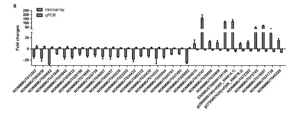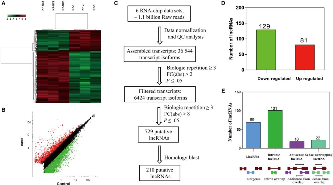 使用芯片技術(shù)檢測lncRNA,差異表達lncRNAs的散點圖和聚類圖顯示了肺腺癌和正常肺樣本之間有明顯區(qū)別(圖A、B)。重點研究了在人和鼠之間具有較高差異倍數(shù)且保守的lncRNAs,當(dāng)FC>8,P<0.05時,鑒定到729個lncRNA。根據(jù)染色體位置保守性和序列保守性,篩選出210個具有潛在人類同源物的lncRNA用于后續(xù)驗證,其中129個上調(diào),81個下調(diào)(圖C、D)。根據(jù)其基因組位置,將210個lncRNA分為u(基因間)、i(內(nèi)含子)、x(反義)和o(正義重疊)四大類。已鑒定的lncRNAs大部分屬于i類,有101個(48.09%)(圖E)。