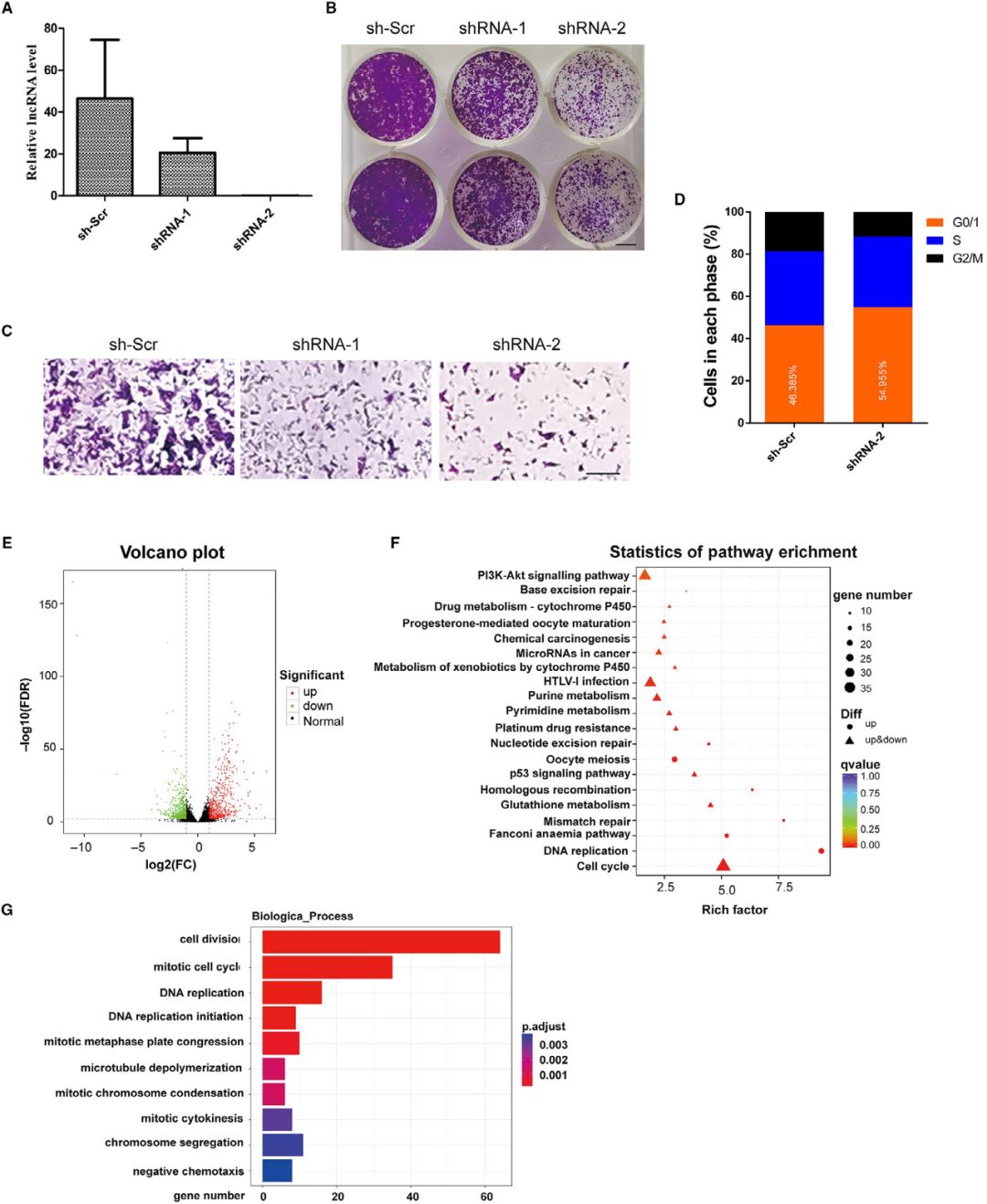 通過設(shè)計慢病毒介導(dǎo)的shRNAs來下調(diào)NONMMUT015812的表達,qPCR結(jié)果顯示其可使KP細胞中NONMMUT015812的表達減少80%以上(圖A)。克隆形成實驗顯示,NONMMUT015812基因的敲除顯著抑制了KP細胞的生長(圖B)。此外,在Transwell實驗中,穩(wěn)定的NONMMUT015812基因敲除的KP細胞與對照細胞相比遷移明顯減少(圖C)。流式細胞術(shù)分析表明,NONMMUT015812基因敲除導(dǎo)致KP細胞明顯阻滯于G0/G1期,G2/M期細胞數(shù)量減少(圖D)。而NONMMUT015812基因敲除對細胞凋亡無明顯影響。