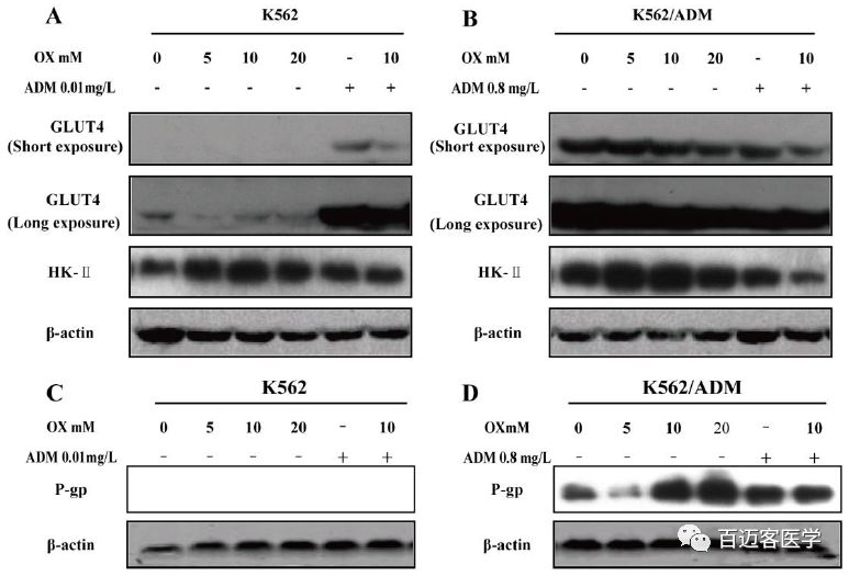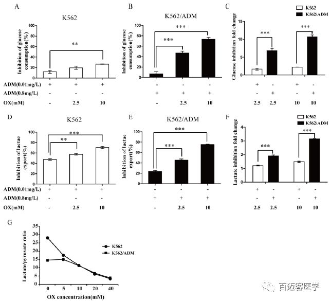 在上述試驗(yàn)中,作者發(fā)現(xiàn)ADM聯(lián)合草酸處理增加了人白血病細(xì)胞的細(xì)胞毒性。然后,作者研究了草酸對ADM處理的K562和K562/ADM細(xì)胞系糖代謝作用的影響,發(fā)現(xiàn)相比于ADM單獨(dú)處理,ADM和草酸共同處理48h后,兩個(gè)細(xì)胞系的葡萄糖消耗和乳酸生成的抑制作用均有所增強(qiáng)。草酸導(dǎo)致兩種細(xì)胞系糖酵解抑制呈現(xiàn)劑量依賴性增加,而耐藥細(xì)胞糖酵解抑制的變化倍數(shù)更高,這與聯(lián)合處理時(shí)耐藥細(xì)胞療效升高倍數(shù)更高所一致,說明草酸對糖酵解的抑制導(dǎo)致葡萄糖消耗和乳酸生成的減少,導(dǎo)致白血病細(xì)胞對ADM的敏感性增加。