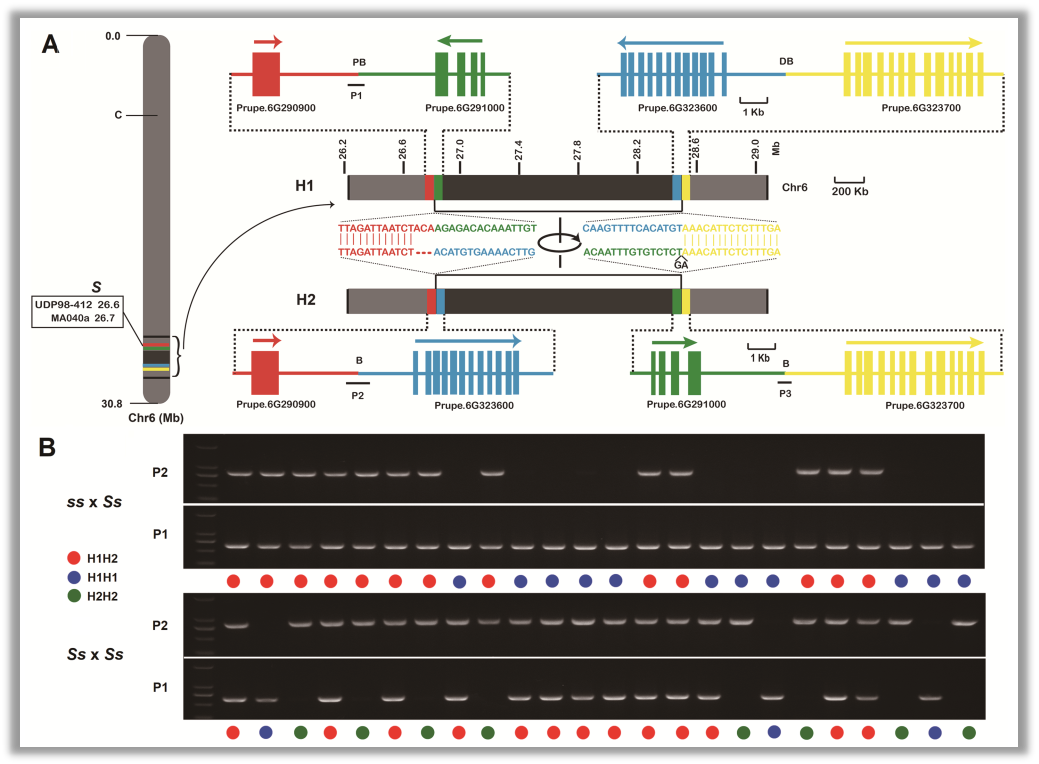 桃起源于250萬年前的中國(guó)青藏高原的西南部,在中國(guó)已有4000年的栽培史,其中有一個(gè)獨(dú)特變種—蟠桃,蟠桃果實(shí)呈扁平狀,體積較小,和我們常見的圓形桃子有明顯區(qū)別,雖然長(zhǎng)相一般,不過它具有酸度低、糖含量高等優(yōu)異品質(zhì),受到越來越多的消費(fèi)者喜愛。蟠桃果實(shí)扁平的特征受6號(hào)染色體上的S位點(diǎn)調(diào)控,同時(shí)S位點(diǎn)與控制鮮重和果實(shí)敗育位點(diǎn)緊密連鎖。關(guān)于S位點(diǎn)的基因定位研究有多次報(bào)道,發(fā)現(xiàn)2個(gè)臨近候選基因(CAD1和LRR-RLK)與果實(shí)扁平的性狀共分離,但后續(xù)又有研究顯示這2個(gè)基因并非與CAD1和LRR-RLK共分離。所以,對(duì)于扁桃扁平性狀的遺傳基礎(chǔ)研究仍待繼續(xù)。
