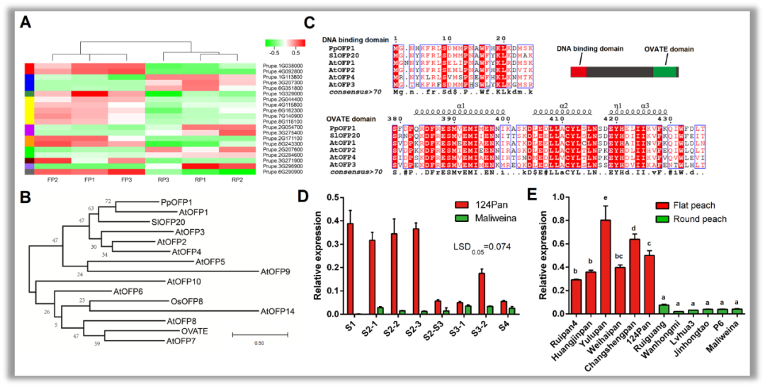 通過比較扁桃和圓桃果實(shí)發(fā)育過程中果實(shí)縱徑和果實(shí)橫徑的變化,發(fā)現(xiàn)在S2時(shí)期兩者果實(shí)增長(zhǎng)均較快(圖2),于是作者在S2時(shí)期選擇多個(gè)扁桃和圓桃進(jìn)行轉(zhuǎn)錄組測(cè)序,結(jié)果在S位點(diǎn)附近發(fā)現(xiàn)1個(gè)在扁桃中上調(diào)差異表達(dá)基因rupe.6G290900(PpOFP1)(圖3A)。PpOFP1與AtOFP1和SlOFP20為同源基因,2個(gè)基因分別負(fù)調(diào)控?cái)M南芥細(xì)胞伸長(zhǎng)以及番茄子房發(fā)育,從而說明PpOFP1很有可能是引起果實(shí)形狀變化的候選基因。在果實(shí)發(fā)育S2期,扁桃果實(shí)中PpOFP1表達(dá)量顯著高于圓桃(圖3D,E),RNA原位雜交也顯示PpOFP1基因在外皮層和內(nèi)皮層細(xì)胞分裂區(qū),該結(jié)果再次證實(shí)PpOFP1在果實(shí)縱向發(fā)育過程中發(fā)揮重要作用。