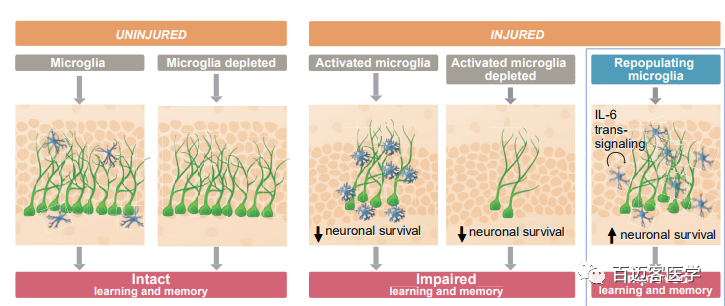 在受到損傷影響的大腦區(qū)域中,激活的小膠質(zhì)細(xì)胞的存在不一定對(duì)結(jié)果和/或認(rèn)知功能障礙有負(fù)面影響,相反,在受損傷后的大腦中,激活的小膠質(zhì)細(xì)胞似乎大多缺乏支持內(nèi)源性修復(fù)過程的能力。然而,在哺乳動(dòng)物的大腦中和再生生物體如蠑螈和斑馬魚,可以誘導(dǎo)出一種可再生的小膠質(zhì)細(xì)胞表型,炎癥信號(hào)在其中發(fā)揮了關(guān)鍵作用。本文已經(jīng)發(fā)現(xiàn)了IL-6信號(hào)通路與這種有益表型相關(guān)的關(guān)鍵作用,未來的研究可以進(jìn)一步確定如何利用小膠質(zhì)細(xì)胞再生的獨(dú)特表型特征進(jìn)行治療。