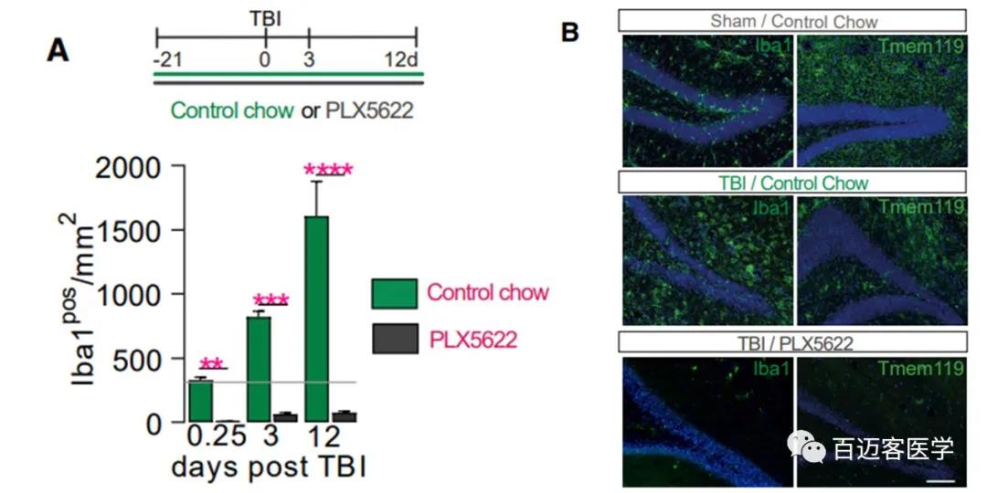 首先通過喂食小鼠集落刺激因子-1受體(CSF-1R)拮抗劑PLX5622 ,使小膠質(zhì)細(xì)胞衰竭,來檢查外傷性腦損傷(TBI)后小膠質(zhì)細(xì)胞缺失是否會(huì)改變海馬依賴任務(wù)中的認(rèn)知結(jié)果。用可控皮質(zhì)撞擊造成TBI,在腦外傷前3周開始持續(xù)給藥PLX5622,可導(dǎo)致大范圍的Iba1pos?、TMEM119pos細(xì)胞的丟失,包括海馬區(qū)。在腦外傷后的整個(gè)實(shí)驗(yàn)時(shí)間內(nèi),海馬區(qū)保持95%的功能缺失。這些結(jié)果與喂食食物的小鼠對(duì)照組形成鮮明對(duì)比。在腦外傷后的12天內(nèi),海馬內(nèi)的Iba1pos細(xì)胞數(shù)量是假手術(shù)組的5倍。