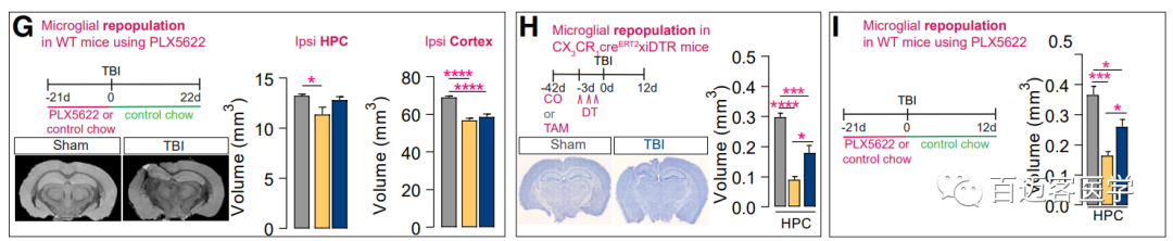 研究還發(fā)現(xiàn),經(jīng)歷過小膠質(zhì)細(xì)胞耗竭和再生的小鼠的大腦海馬組織體積更大(圖3G-I)。
