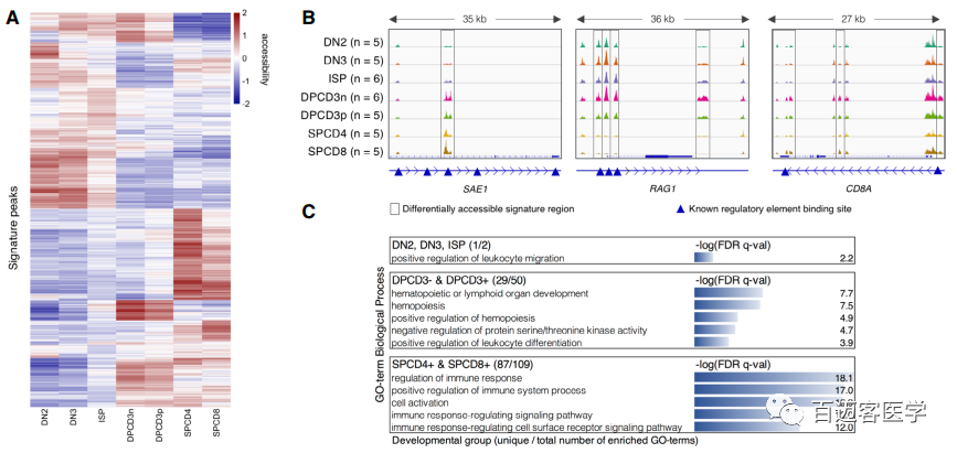 所有特征區(qū)域聚類熱圖將7個(gè)T細(xì)胞類群按其成熟的順序聚集在一起,突出了T細(xì)胞成熟過程中染色質(zhì)可及性的持續(xù)變化(圖2A)。連續(xù)發(fā)育階段的逐漸變化導(dǎo)致了DN3和ISP之間的輕度分離,雙陽性階段CD3和CD3+(圖2A)導(dǎo)致在使用CIBERSORT反褶積算法預(yù)測細(xì)胞類型預(yù)測精度不理想。利用主成分1和2的轉(zhuǎn)換,量化了特征OCRs的重要性并發(fā)現(xiàn)SUMO1激活酶亞基1上有一個(gè)峰(圖2B)。此外,OCRs差異可及性附近有階段性特征已知基因如CD8ARAG1/2(圖2B)。雙陽性組OCRs在與造血和白細(xì)胞分化相關(guān)的terms富集,單陽性組在免疫系統(tǒng)調(diào)節(jié)相關(guān)的terms富集(圖2C)。然而,雙陰性特征峰只富集在一個(gè)GO-term即白細(xì)胞遷移正調(diào)節(jié)(圖2C)。