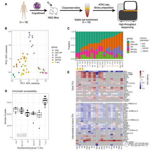 圖4 T-ALL染色質(zhì)可及性概況與正常人T細(xì)胞發(fā)育的不成熟階段最相似